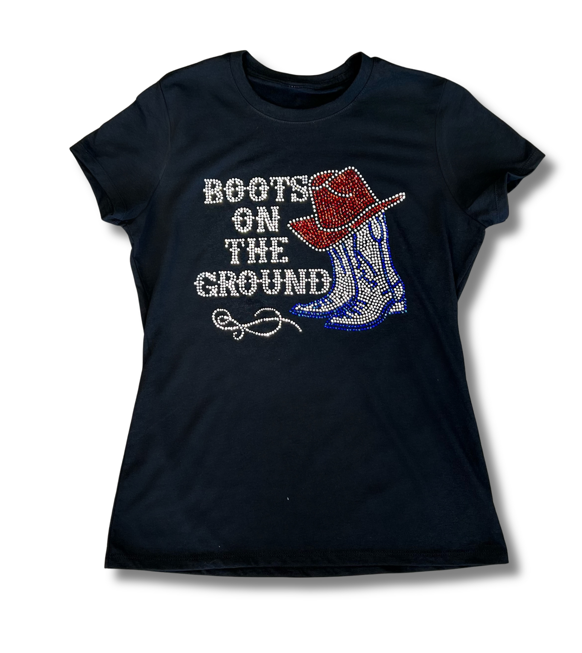 Hop on the Boots on the Ground trend with this bold and brilliant Bling Tee. Designed to turn heads!