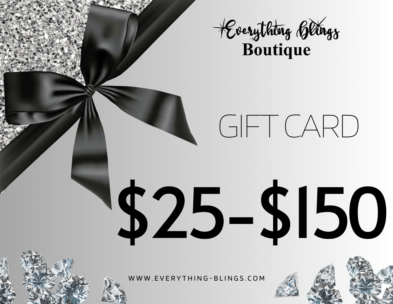 Give the gift of S.P.A.R.K.L.E. and style with an Everything Blings gift card! Available in denominations ranging from $25 to $150. Treat yourself, or someone you love to the perfect gift, because everyone deserves a little extra bling!!!